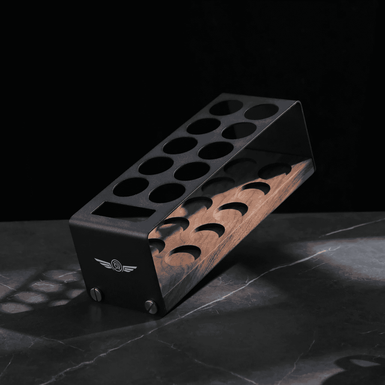 Exklusiver Aufbewahrungsständer Dedizierter 10-Slot-Ständer aus Stahl und Holz mit abgewinkeltem Design für 3-Sekunden-Flaschenzugriff, löst Arbeitsplatten-Unordnung.