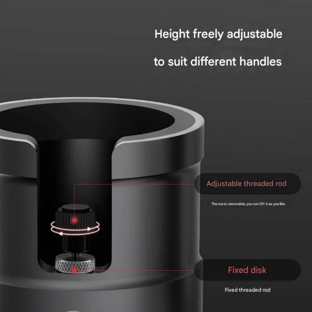 Einstellbare Höhe für universelle Kompatibilität Ausgestattet mit einer einstellbaren Gewindestange und stabiler Plattform ist dieser Tamper Stand kompatibel mit verschiedenen Marken und Modellen von 58mm Kaffeemaschinen-Griffen und bietet Flexibilität für personalisierten Einsatz.